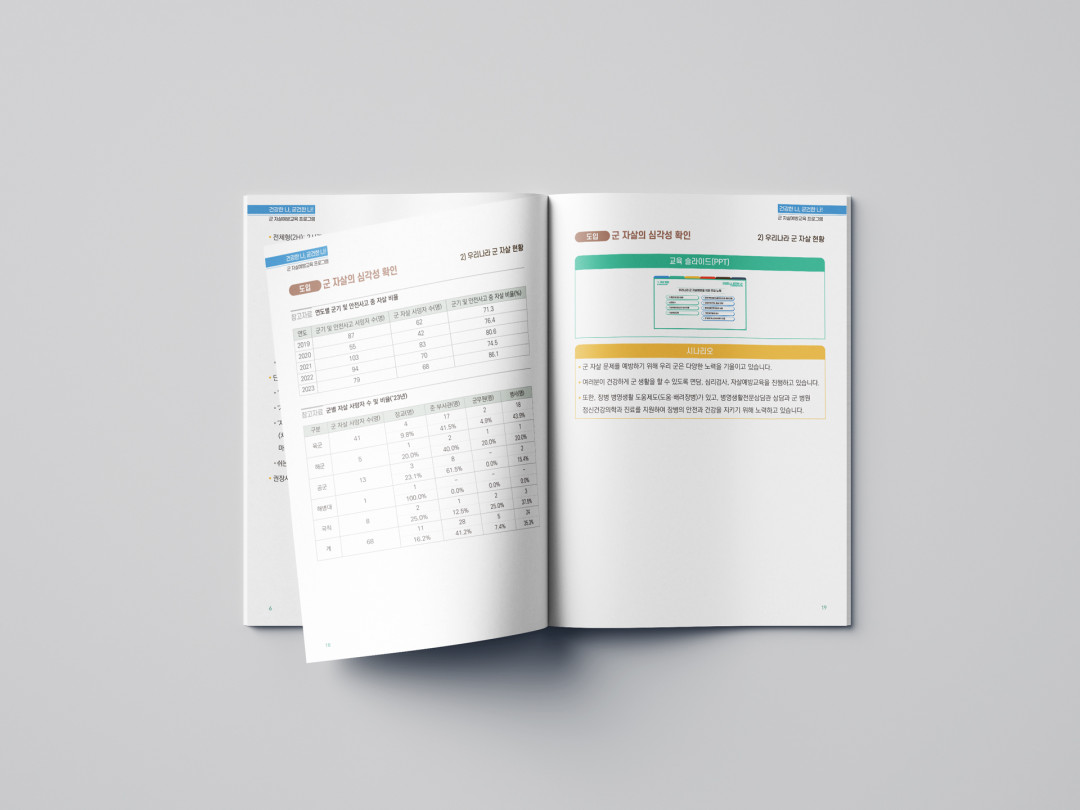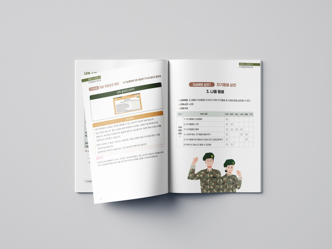 [편집디자인] 군자살예방교육프로그램 책자 페이지 정보 작성자 권디자인랩 작성일 2025-07-28 18:09 조회 119 댓글 0 공유 페이스북 공유 트위터 공유 본문 군자살예방교육프로그램 책자간부용 / 병사용 각 1권사이즈 197×272페이지 60페이지 추천0 이전글 홍삼볼 홍보 전자책 다음글 물놀이안전! 물환경보전! 교육 가이드북 A4 댓글목록 0 등록된 댓글이 없습니다.