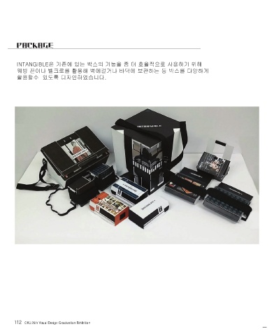 여기에 머릿말 쓰이는 부분입니다. 여기에 머릿말 쓰이는 부분입니다. INTANGIBLE은 기존에 있는 박스의 기능을 좀 더 효율적으로 사용하기 위해 웨빙 끈이나 벨크로를 활용해 벽에걸거나 바닥에 보관하는 등 박스를 다양하게 활용할수 있도록 디자인하였습니다. 112 CKU 26th Visual Design Graduation Exhibition 여기에 꼬릿말 쓰이는 부분입니다. 03 04 여기에 꼬릿말 쓰이는 부분입니다.