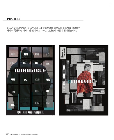 여기에 머릿말 쓰이는 부분입니다. BE AN ORIGINAL은 INTANGIBLE의�슬로건으로�브랜드의�옷을착용�함으로써 하나의�독창적인�이미지를�선사하고자하는 브랜드의�바람이�담겨있습니다. 116 CKU 26th Visual Design Graduation Exhibition