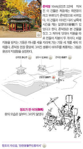 채롭다. 존덕정 천장 중앙에 그려진 쌍룡이 여의주를 희롱하는 그림은